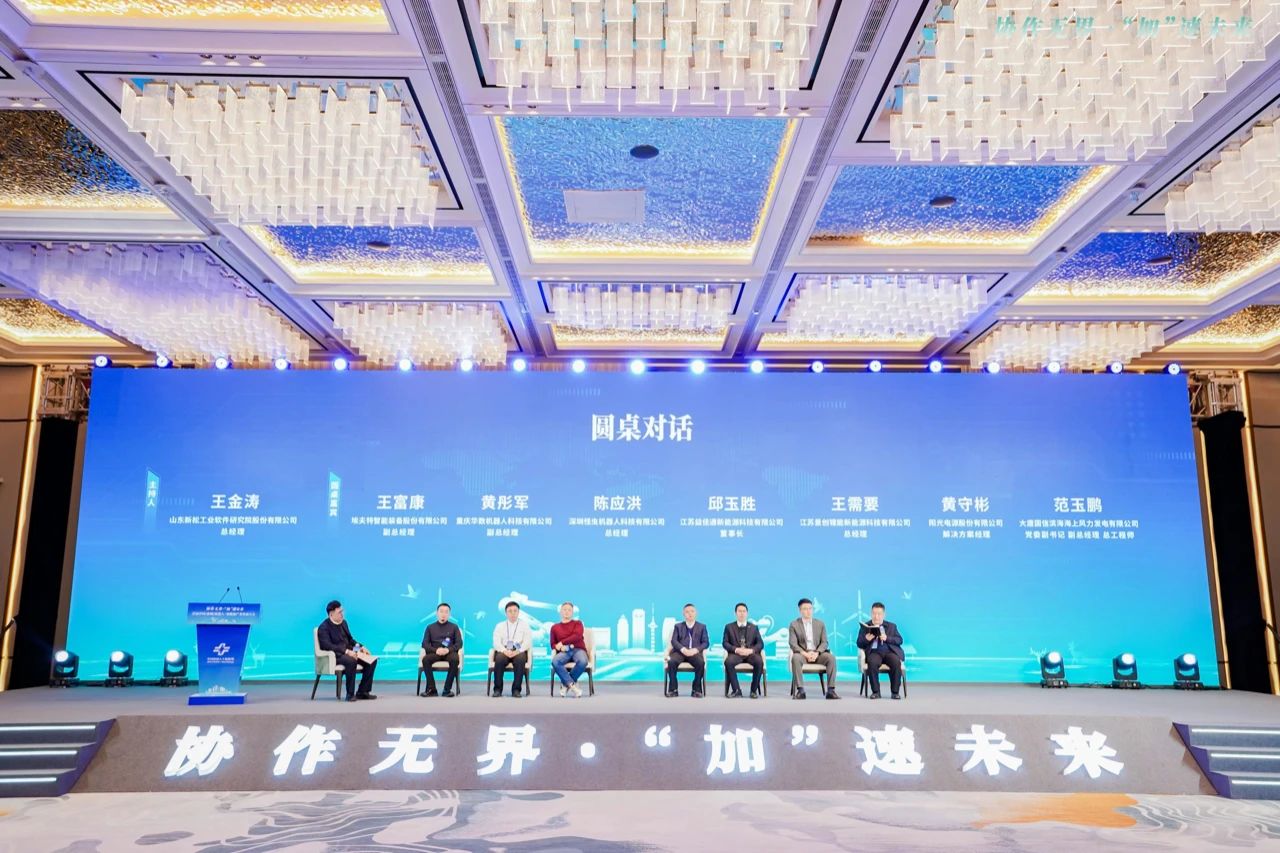 埃夫特智能装备股份有限公司副总经理王富康、重庆华数机器人科技有限公司副总经理黄彤军、深圳怪虫机器人科技有限公司总经理陈应洪、江苏益佳通新能源科技有限公司董事长邱玉胜、江苏景创锂能新能源科技有限公司总经理王需要、阳光电源股份有限公司解决方案经理黄守彬、大唐国信滨海海上风力发电有限公司党委副书记副总经理总工程师范玉鹏共同参与,并就新能源行业未来走向,机器人解决方案现状、合作现状、升级创新方向、合作路径等议题同台共话。本次对话由山东新松工业软件leyu.乐鱼股份有限公司总经理王金涛主持。