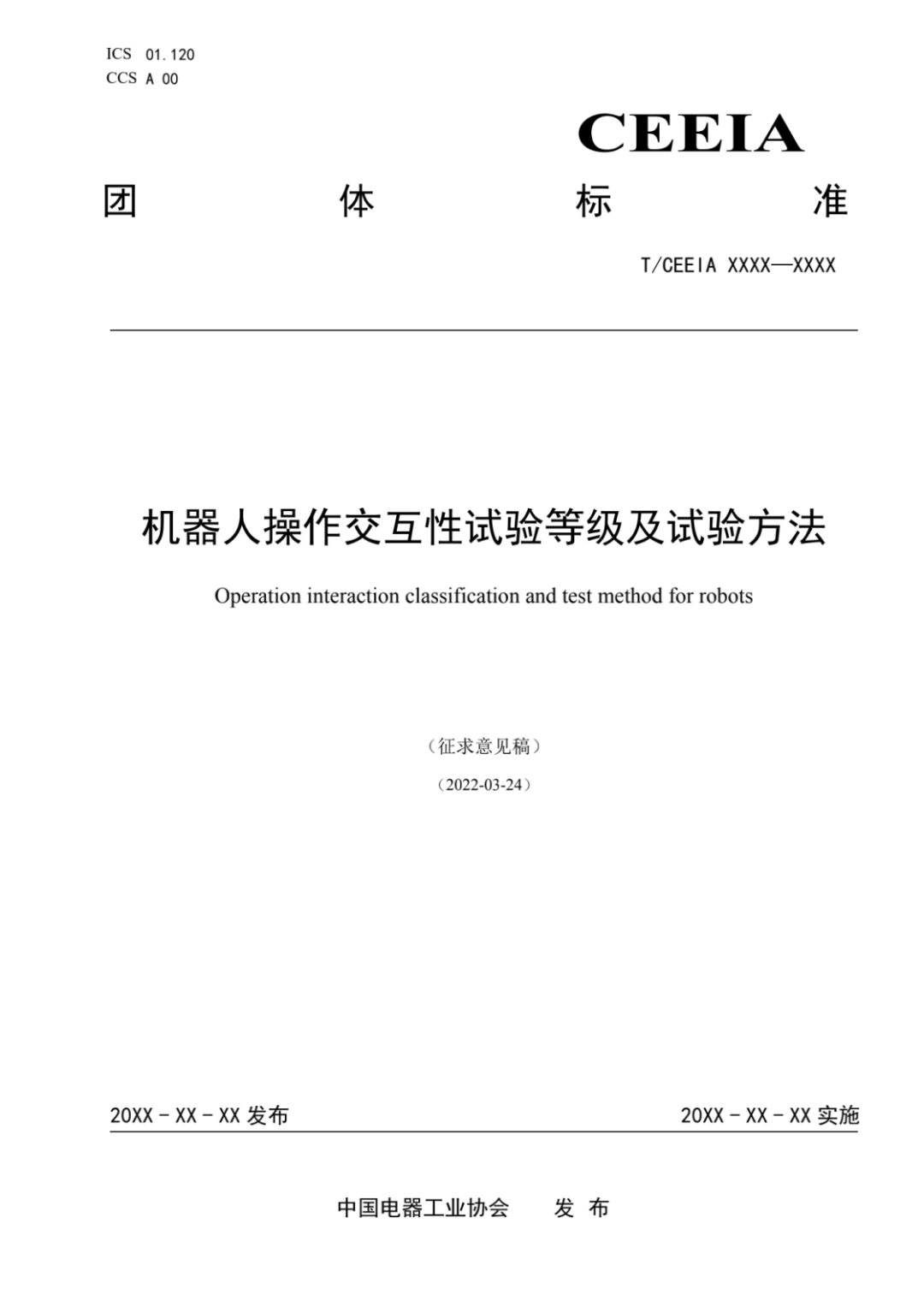 《操作交互性试验等级及试验方法》由中国电器工业协会标准化工作委员会提出,由中电协电气场所用机器人安全与检测标准化专业委员会归口(项目编号为:T/CEEIA2021118)。